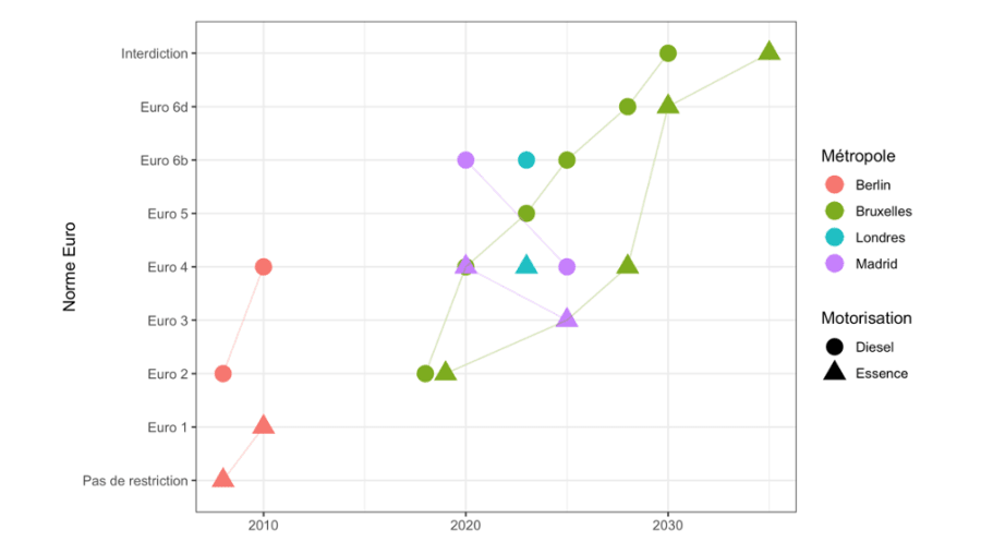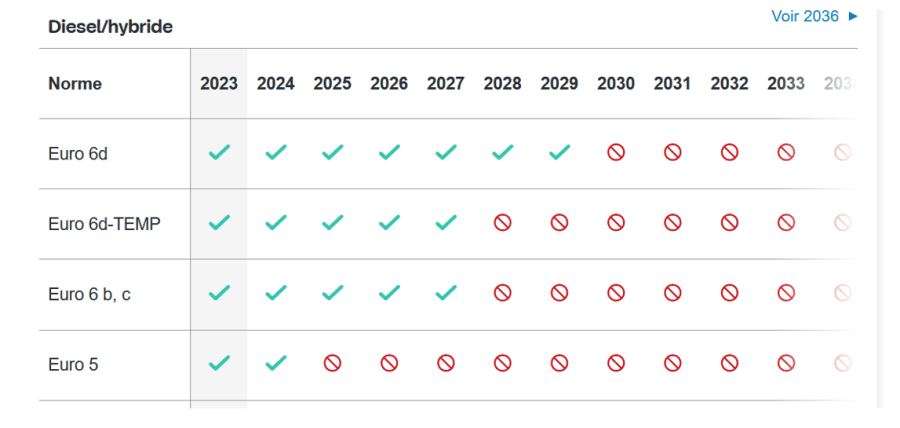 Adoptée en 2021, dans la foulée des propositions de la Convention citoyenne pour le climat, la loi Climat et résilience a cependant durci ce premier cadre législatif en imposant aux agglomérations en dépassement un calendrier de restrictions précis avec interdiction de circulation des véhicules portant des vignettes Crit’Air 3, 4 et 5 : les Crit’Air 5 (véhicules diesel qui ont plus de 22 ans) en 2023, les Crit’Air 4 (véhicules diesel qui ont plus de 18 ans) en 2024 et les Crit’Air 3 (véhicules diesel qui ont plus de 12 ans et véhicules à essence qui ont plus de 18 ans) en 2025.