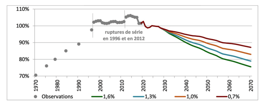 Or, dans les prochaines décennies, la masse salariale des régimes publics ainsi équilibrés devrait diminuer significativement, passant de 11 % à environ 9 % de la masse salariale totale. Cette baisse ne résulte pas d’une réduction des effectifs de fonctionnaires mais d’une évolution plus lente des rémunérations et de l’emploi publics par rapport au privé.