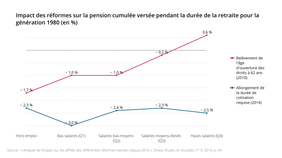 Cela revient à financer à crédit aux retraités actuels un niveau de vie anormalement élevé, tout en organisant sans le dire le décrochage à venir du niveau de vie des cotisants d’aujourd’hui. Plus inquiétant encore, cette injustice envers les actifs menace d’être aggravée par le choc inflationniste que nous traversons. En effet, l’envolée des prix de l’énergie importée depuis le déclenchement de la guerre en Ukraine se traduit par une perte de revenu pour l’économie française, estimée à environ 60 milliards d’euros et qu’il faut répartir entre les ménages, les entreprises et les administrations publiques. Alors qu’ils représentent près d’un quart de la population, les retraités sont pourtant largement exonérés du partage de ce fardeau, dès lors que les pensions des régimes de retraite de base sont indexées de droit sur l’inflation et ont même bénéficié d’une revalorisation anticipée l’été dernier. À l’inverse, l’Insee estime que le salaire moyen par tête réel, c’est-à-dire corrigé de l’inflation, devrait avoir reculé de 1,9 % à l’issue de l’exercice 2022. Déjà critiquable par temps calme, la préférence française pour les retraités devient indéfendable dans le contexte inflationniste actuel. Même si l’on admettait de se concentrer sur le seul levier de l’âge de départ pour générer des économies, il existe plusieurs moyens pour y parvenir, au premier rang desquels figurent la hausse de l’âge légal et l’augmentation de la durée de cotisation requise pour le taux plein. Si le projet gouvernemental n’est pas encore connu, le report de l’âge légal de départ à la retraite de 62 à 65 ans resterait l’option privilégiée, conformément aux engagements de campagne du Président de la République. Or, les réformes augmentant l’âge légal de départ à la retraite ont des effets anti‑redistributifs nettement plus importants que celles allongeant la durée de cotisation nécessaire pour partir à taux plein, car les hauts salaires ont souvent commencé à travailler tardivement et partent donc spontanément à la retraite à un âge plus élevé que l’âge légal. Une évaluation comparée des effets du relèvement de l’âge légal de 60 à 62 ans (2010) et de l’allongement à 43 ans de la durée de cotisation (2014) réalisée par la Drees permet de prendre conscience de l’ampleur du problème. Alors que l’allongement de la durée de cotisation se traduit par un effort de même ampleur des différentes catégories sociales, la hausse de l’âge légal pèse plus fortement sur les plus modestes et se traduit à l’inverse par un léger gain pour les plus aisés – la baisse de la durée de la retraite étant plus que compensée pour ces derniers par l’accumulation de droits supplémentaires avant le départ (graphique 12). Le Monde titrait ainsi sur la remise en cause de la revalorisation des petites pensions pour les personnes déjà à la retraite, malgré la promesse de campagne du Président de la République. Là encore, la réforme de 2014 montre pourtant l’intérêt qu’il y aurait à accompagner la réforme de mesures ciblées sur les plus modestes. Ainsi, l’évaluation de la Drees précitée conclut que l’assouplissement des conditions pour valider un trimestre a permis de donner un profil redistributif à la réforme, en épargnant en partie les personnes à bas salaire. En l’état, les progressistes ne peuvent donc accepter de devoir choisir entre un coûteux statu quo et une réforme inéquitable qui fragilise les plus modestes. Les pistes ne manquent pourtant pas pour construire une réforme alternative conciliant justice sociale et responsabilité budgétaire. Au terme de cette analyse, il apparaît que la recherche d’un compromis soutenable à la fois budgétairement et socialement pourrait s’appuyer sur trois lignes directrices : Sans prétendre à l’exhaustivité, cette dernière partie esquisse différentes pistes qui permettront à chacun de se faire sa propre opinion et de vérifier que les solutions proposées sont compatibles avec l’objectif d’économies de 16 milliards d’euros à horizon 2030. Alors que la France se singularise par un âge de départ à la retraite particulièrement précoce, il apparaît légitime de mobiliser ce levier d’économies. En la matière, l’arbitrage entre le relèvement de l’âge légal et l’augmentation de la durée de cotisation nécessite de concilier justice et efficacité. Car si augmenter l’âge légal est anti‑redistributif, ce levier génère davantage d’économies à court terme que la hausse de la durée de cotisation, en forçant de nombreux cotisants à décaler leur départ. Ce n’est en revanche pas le cas à long terme car ces départs plus tardifs conduisent à des retraites plus élevées, comme le rappelle le comité de suivi des retraites dans son dernier avis. Dans ce contexte, une solution de compromis pourrait consister à anticiper l’augmentation de la durée de cotisation à 43 ans prévue par la réforme Touraine, tout en augmentant l’âge légal à 63 ans au lieu de 65 ans. Sur la base des simulations effectuées par le COR fin 2019 dans la convention EPR9, on peut estimer que cela suffirait pour générer près de 0,5 point de PIB d’économies à horizon 2030, soit environ 12 milliards d’euros. Dégager le même montant d’économies en jouant uniquement sur la durée de cotisation nécessiterait à l’inverse une très forte augmentation de celle-ci (passage de 42 ans à près de 45 ans en six générations seulement), qui apparaît difficilement soutenable. Pour parvenir à générer les 16 milliards d’euros d’économies nécessaires pour retrouver l’équilibre en 2030, il serait nécessaire de partager les efforts avec le reste de la population. Il paraît logique de ne pas en demander davantage aux actifs, dès lors que leur contrib