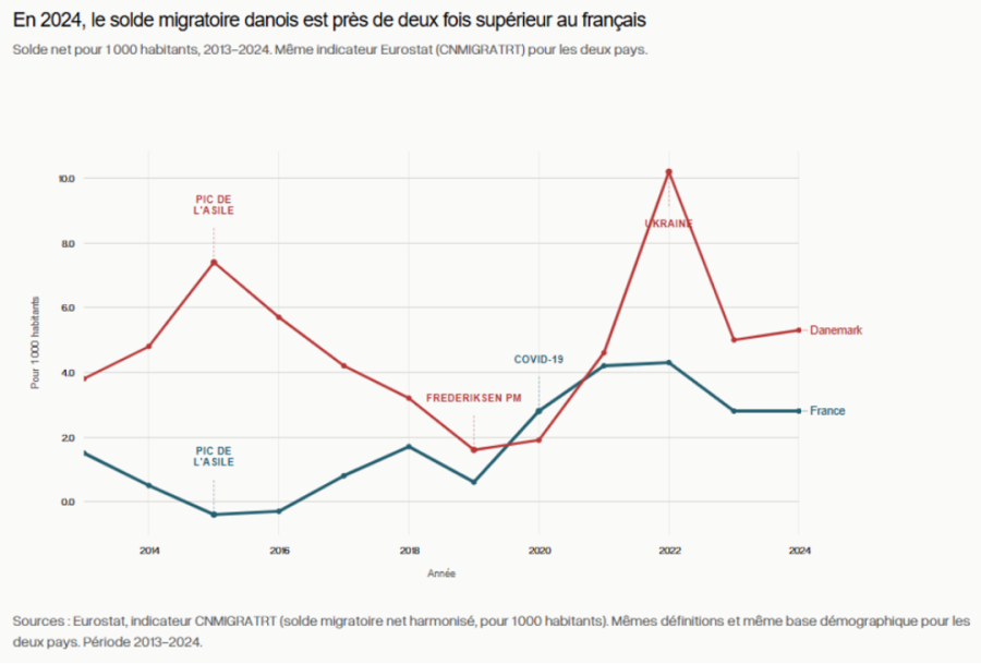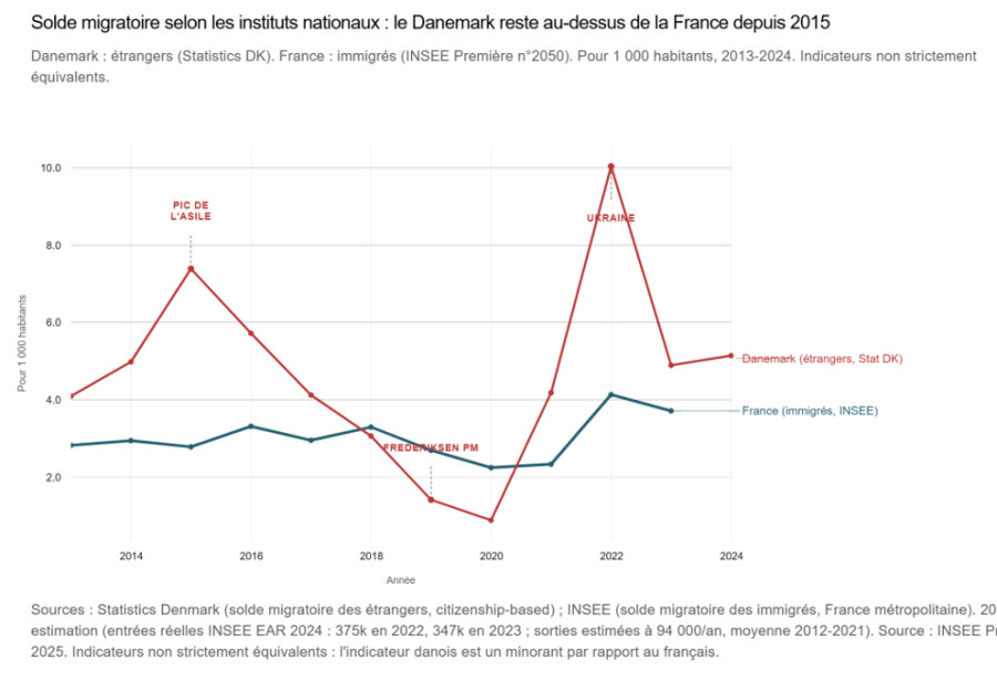 Si l’on considère les soldes migratoires nets rapportés à la taille de la population, le Danemark est pourtant resté, depuis 2013, presque toujours plus ouvert que la France, y compris depuis l’élection de Mette Frederiksen en 2019. Des deux pays, à dire vrai, c’est la France qui semble avoir le plus régulé ses flux.