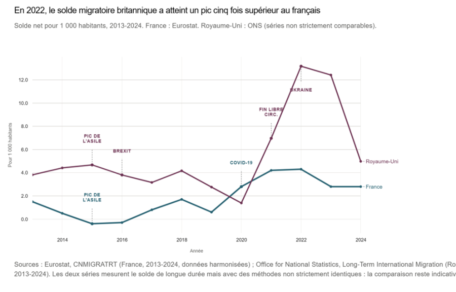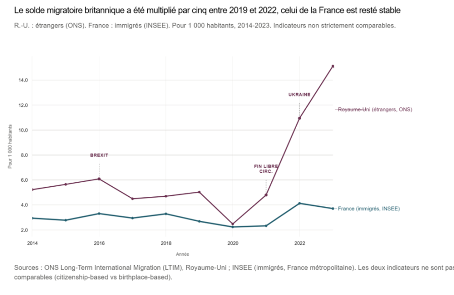 Le tableau n’est pas très différent quand on compare la France au Royaume-Uni où pourtant le Brexit s’est joué en grande partie sur la question migratoire. L’observation confirme qu’en dépit de cette décision, les flux migratoires sont restés nettement plus soutenus outre-Manche qu’en France.