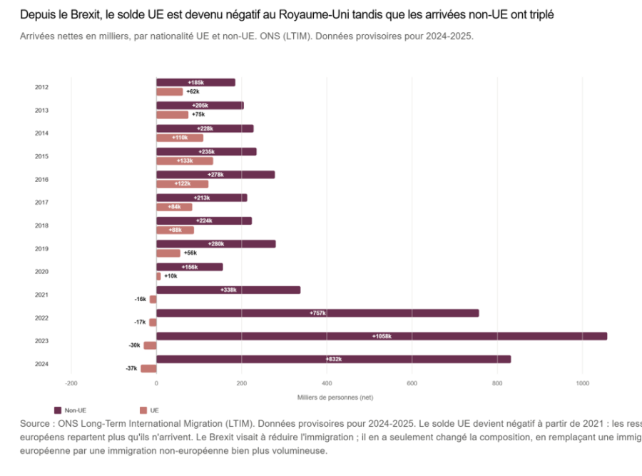 Ce changement radical à partir de 2020 correspond à la mise en œuvre du Brexit : les ressortissants de l’UE viennent moins, voire s’en vont, et il faut les remplacer… Le Brexit, qui avait été adopté en partie pour limiter l’immigration, entraine son augmentation dans des proportions rarement atteintes depuis l’après-guerre.