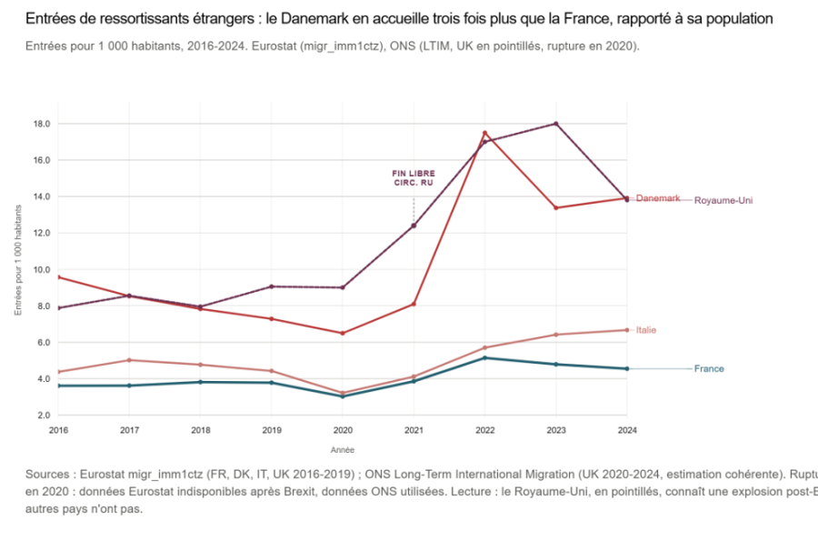 Le résultat de ces comparaisons est saisissant : rapporté à la population de chaque pays, le solde migratoire net français en 2024 est 2 fois inférieur à celui de l’Italie, 2.4 fois inférieur à celui du Danemark et 4.3 fois inférieur à celui du Royaume-Uni. Ces écarts ne sont pas démentis – ils sont au contraire parfois plus forts – lorsqu’on compare le solde migratoire des immigrés en France avec le solde migratoires étrangers dans ces trois pays. Et ils vont dans le même sens lorsqu’on considère uniquement le nombre d’entrées d’étrangers pour 1000 habitants : en 2024, l’Italie est, de ce point de vue, 1.5 fois plus ouverte que la France, le Royaume-Uni 2.5 fois et le Danemark 3 fois. Si la France avait le même degré d’ouverture que le Danemark en 2024, ce ne sont pas 312 000 entrées d’étrangers que nous aurions comptabilisées, mais près d’un million ! Et près de 800 000 si nous avions le même degré d’ouverture que le Royaume-Uni.