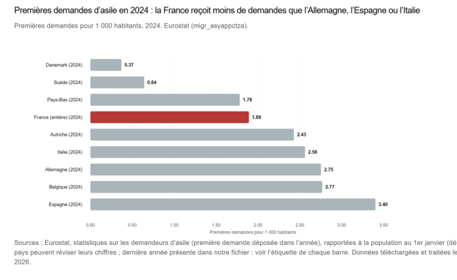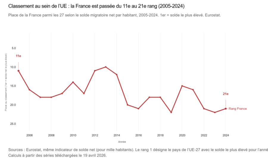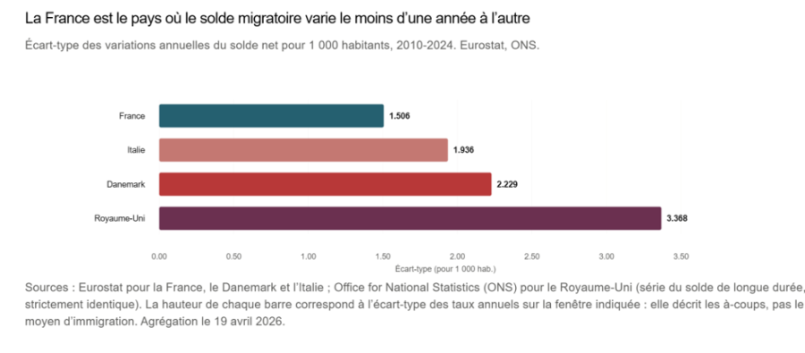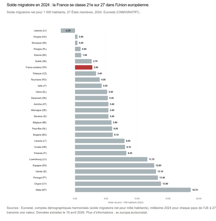- Rapporté au solde migratoire pour 1000 habitants, la France est aujourd’hui l’un des pays les plus fermés d’Europe. Cela ne signifie pas qu’elle accueille moins en valeur absolue (ses entrées brutes se tiennent entre 4 et 5 pour 1000 sur la période), mais elle est manifestement plus fermée à la pression migratoire que ses voisins :