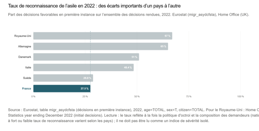 Toutefois, comme le montre le graphique ci-dessus, ce ne sont pas les demandes d’asile qui font la différence : là encore, la France reste dans le bas de la fourchette. Et si elle accueille favorablement, en 2022, environ un tiers de ces demandes contre 1 sur 5 en Italie et 1 sur 4 au Danemark, c’est encore une proportion nettement inférieure à ce que l’on observe au Royaume-Uni (2 sur 3) ou en Allemagne (1 sur 2).