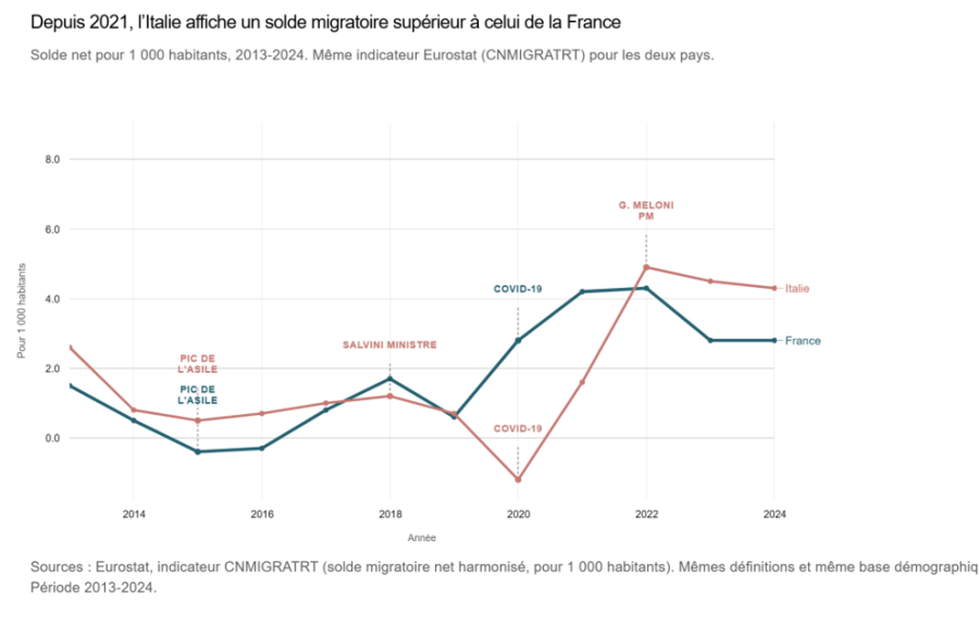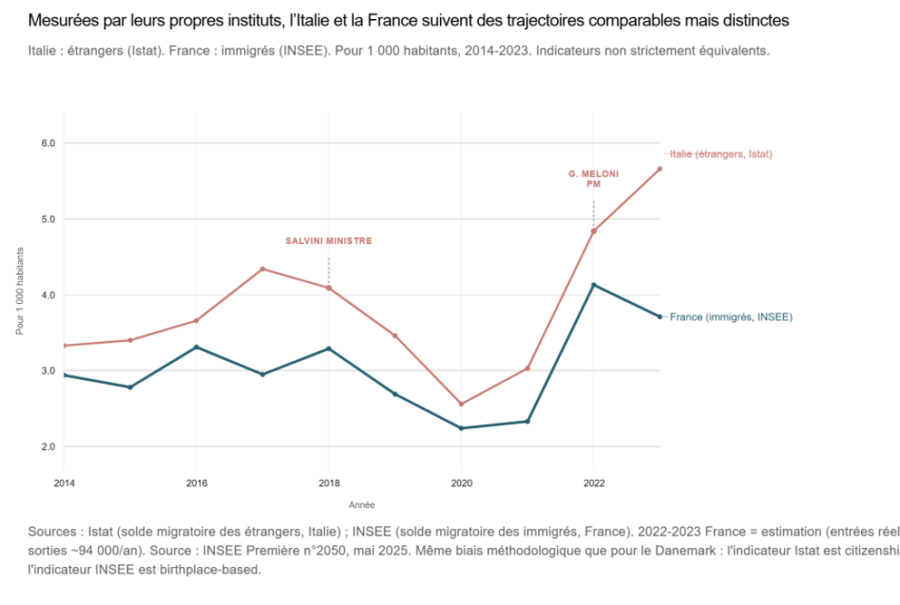 Le même exercice de comparaison aboutit à des conclusions voisines quand on s’arrête sur le cas italien. Alors qu’une droite radicale y est au pouvoir sous la conduite de Giorgia Meloni depuis 2022, l’ouverture à l’immigration y est, à l’exception des années 2018 et 2020 (période Covid pour cette dernière année), toujours plus forte qu’en France.