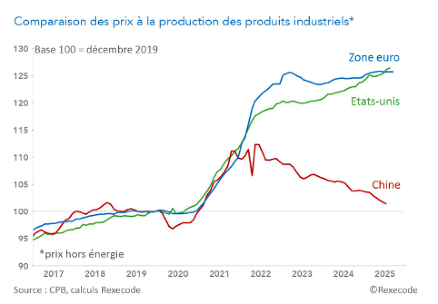 Dans notre étude sur l’hypercompétitivité chinoise, nous présentons un graphique qui résume bien les choses. Il s’agit de l’évolution des prix à la production. On voit clairement un décrochage au printemps 2022 : les prix de la production chinoise baissent, tandis qu’en Europe, classiquement, les coûts de production progressent régulièrement.