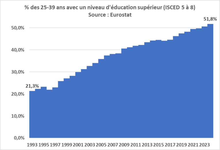 Parallèlement les gouvernements successifs ont poussé au contraire les jeunes à prolonger toujours plus leurs études. En 1993, 21 % des 25-39 ans avaient suivi des études supérieures, en 2024, ce pourcentage était monté à 52 % selon les données d’Eurostat. Cette proportion a donc plus que doublé en trente ans. Ce n’est évidemment pas une mauvaise politique d’avoir cherché à élever ainsi fortement le niveau de formation initiale des jeunes français même si cela a le plus souvent été fait dans de mauvaises conditions avec notamment des budgets par étudiant en baisse sensible sur cette période et une dégradation marquée des conditions d’études dans les universités françaises. La France était en effet plutôt en retard sur le plan de la qualification de sa main d’œuvre par rapport aux autres pays développés dans les années 1970 et 1980.