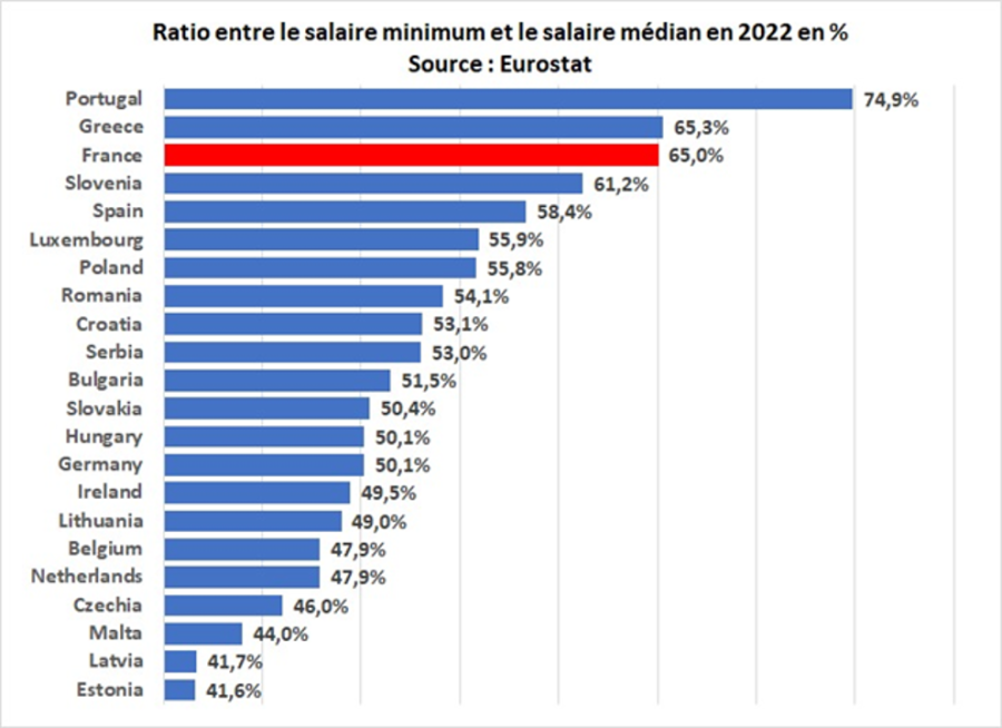 Lecture : en France, le salaire minimum représente 65 % du salaire médian. Autrement dit la moitié des salariés gagne entre 1 SMIC et 1,5 SMIC. Tandis qu’en Allemagne, cette moitié gagne entre 1 et 2 salaires minimums. La France est un des pays d’Europe où le plus de salariés ont un salaire proche du SMIC.