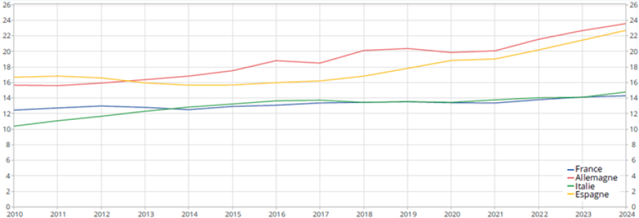 1. La population immigrée en âge de travailler a progressé de 7.3% en France entre 2019 et 2024. C’est sensiblement la même dynamique qu’en Italie (+6.9%) où les décrets « flussi » ont permis de faire entrer plusieurs centaines de milliers de travailleurs étrangers. Mais c’est surtout beaucoup moins qu’en Allemagne (+14.2%) et en Espagne (+33%). La France n’est pas plus ouverte que l’Italie de Meloni, et beaucoup moins que l’Espagne du socialiste P. Sanchez ou que l’Allemagne du social-démocrate Olaf Scholz hier ou du chrétien-démocrate Friedrich Merz aujourd’hui.
