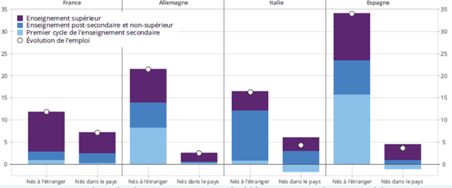 5. 15% de la baisse du nombre de chômeurs (-190 000 personnes depuis 2019) peut être imputée aux immigrés contre 14% en Italie, alors qu’en Allemagne et en Espagne, les immigrés contribuent au contraire positivement au chômage.