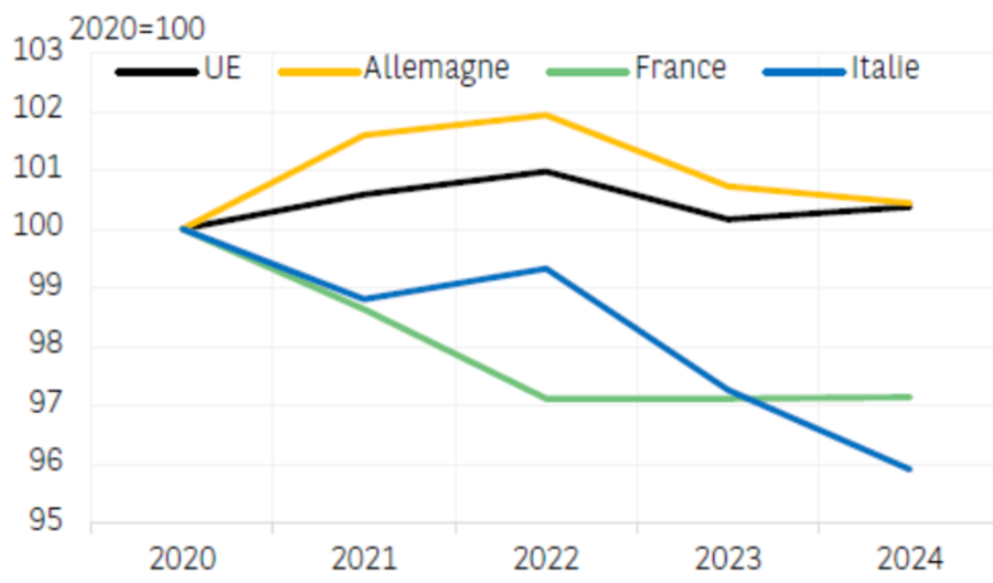 La réduction de ce Superbonus immobilier a de fait marqué la fermeture de la parenthèse Covid et des politiques non-conventionnelles qui furent alors déployées. Mais elle n’a été possible sans effet macro-économique majeur que parce que d’autres politiques non-conventionnelles prenaient le relais du soutien à l’investissement, en l’occurrence les fonds européens du PNRR. Sans eux, l’Italie aurait probablement été en récession au cours des dernières années.
