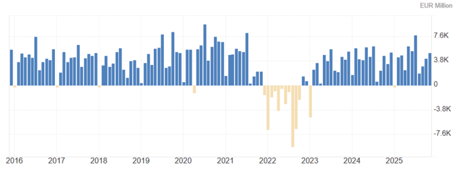 Solde de la balance commerciale italienne en millions d’euros depuis 2016