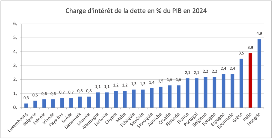 Avec un ratio de dette sur PIB de près de 138% fin 2025, l’Italie reste, derrière la Grèce, le deuxième Etat le plus endetté de l’Union européenne. En période de taux bas, voire négatifs, comme ceux que nous avons connus dans les années 2010, cette situation n’est pas forcément très handicapante. Mais quand les taux remontent, le fardeau de la dette devient rapidement colossal. Or les taux d’intérêt à 10 ans pour la dette italienne sont passés à 3,5 % fin 2025 contre 0.5 à 0.6% début 2021. Ainsi la charge d’intérêt de la dette italienne a atteint 85 milliards d’euros en 2025 (3,9% du PIB). Rapporté à son propre PIB, c’est comme si la France avait eu une charge d’intérêt de 110 milliards en 2025 (le double des 55 milliards d’euros réellement payés en France l’an dernier), soit plus de la totalité des recettes de TVA. C’est la charge d’intérêts la plus élevée de l’UE derrière la Hongrie : l’Italie dépense aujourd’hui autant pour rembourser les intérêts de sa dette que pour financer l’enseignement public, et trois fois plus que pour financer sa défense.