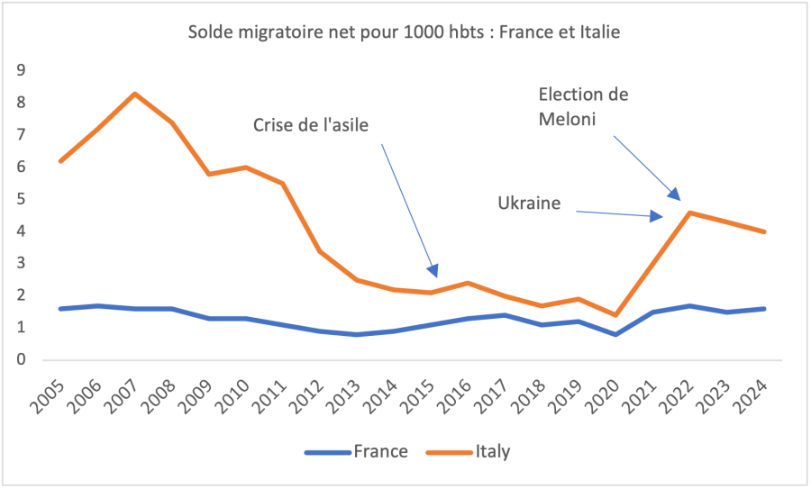 En somme, même s’il reste des poches de sous-emplois (notamment chez les femmes), le problème principal de l’économie italienne n’est plus un excès de bras et de cerveaux, mais plutôt un manque. Raison pour laquelle, en matière migratoire aussi, le gouvernement Meloni a fait le contraire de ce qu’il préconisait pendant la campagne de 2022 : il a accordé des centaines de milliers de titres de séjour à des travailleurs étrangers. Raison pour laquelle le solde migratoire italien rapporté à la population reste très supérieur à ce qu’il est en France où la politique migratoire, quoique violemment dénoncée par l’extrême-droite et Les Républicains, est plus restrictive au total :