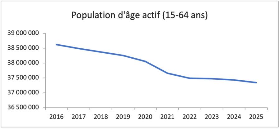 Selon les données de l’OIT, entre 2014 et 2024, la population en âge de travailler (15-64 ans) a perdu 1,93 millions de personnes en Italie. Et si l’on ne compte que la population en âge de travailler née en Italie, la perte sur la même période est même de 2,97 millions de personnes, soit une baisse de 8,7% en 10 ans.