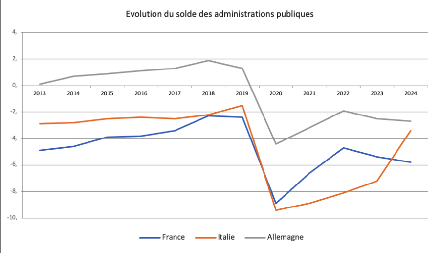 Toutefois, avec un déficit de 3.4% en 2024, l’Italie occupe encore le 10e rang européen : ce déficit certes beaucoup plus faible qu’en France (-5.8%), mais il est plus important que la moyenne de l’UE à 27 (-3%) et beaucoup plus qu’en Allemagne (-2.7%). Pas de quoi pavoiser… D’autant qu’en longue période et en dépit du PNRR, l’Italie a juste rejoint son niveau de déficit d’avant pandémie, comme le montre le graphique ci-après.