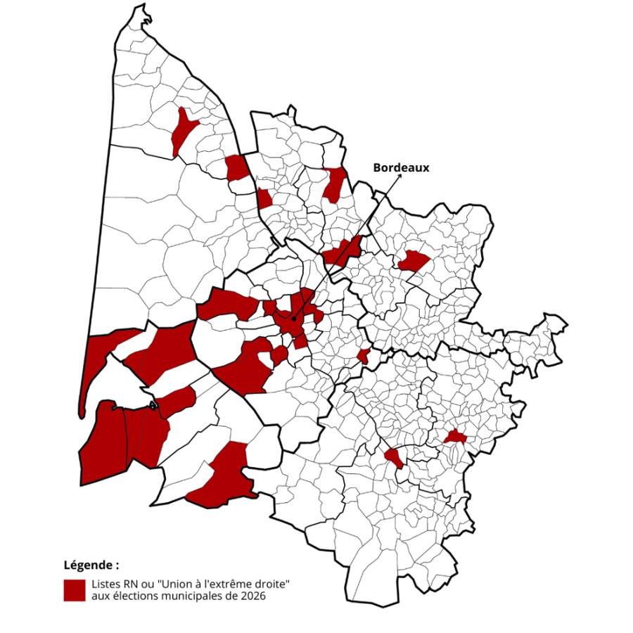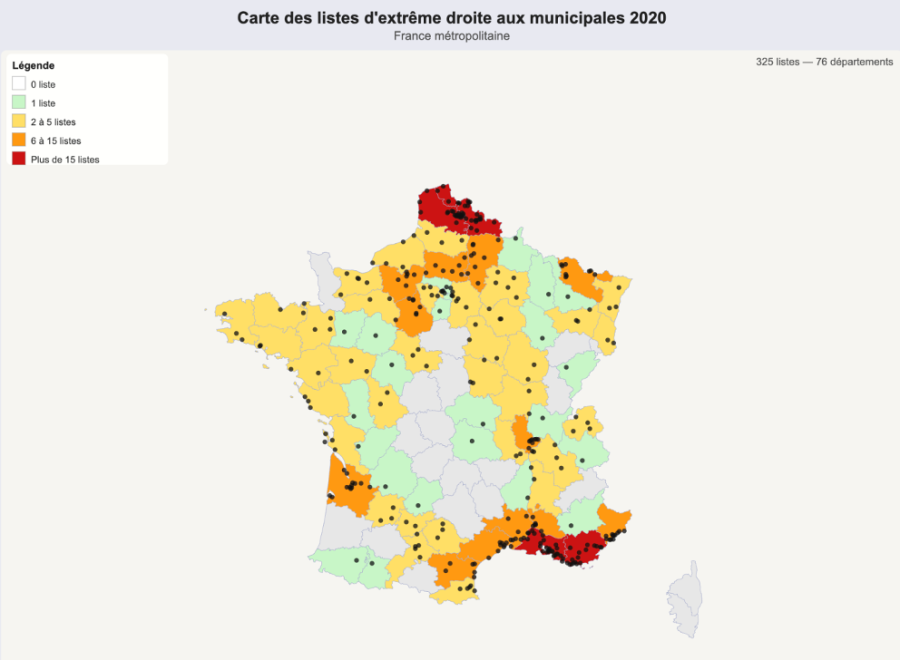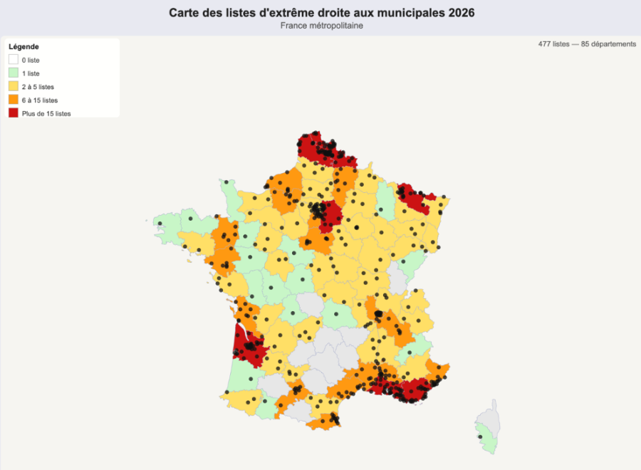 Les listes venant d’être officiellement déposées, qu’en est-il au juste ? Le décompte n’est pas si simple car, pour se repérer dans la nomenclature du ministère de l’Intérieur, il faut jouer avec les quatre étiquettes de la galaxie d’extrême-droite : les listes « Rassemblement National » (LRN), les listes « Union à l’extrême droite » (LUXD), les listes « Extrême-droite » (LEXD) et les listes « Union des droites pour la République » (LUDR). Au total, ces différentes nuances regroupent 592 listes dans l’ensemble des communes françaises. Mais toutes n’embarquent pas des candidats du RN. Il arrive même que plusieurs listes d’extrême-droite s’affrontent dans la même commune. C’est le cas à Cogolin dans le Var où quatre listes d’extrême-droite vont s’opposer dans un affrontement fratricide : « Cogolin notre priorité » (LEXD), « Cogolin d’abord » (LUXD), « Cogolin demain » (LEXD) et « Rassemblement municipal » (LEXD).