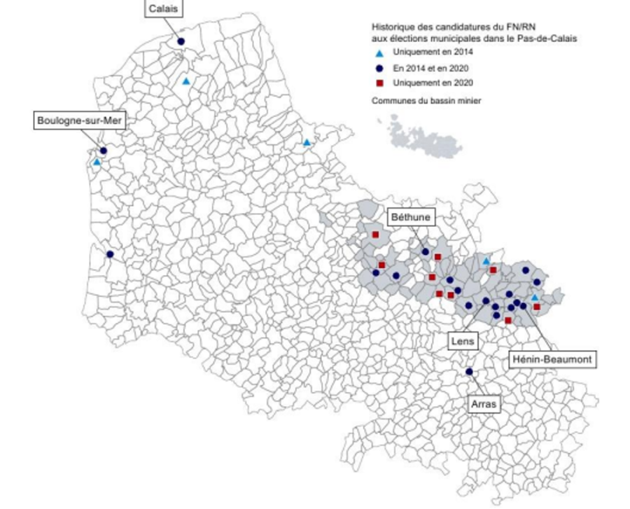 Même dans les départements où le RN est très présent, la cartographie de son implantation révèle la faiblesse de son ancrage local. En visualisant la localisation des listes RN dans le Pas de Calais entre 2014 et 2020, la carte ci-après montre à l’évidence l’étendue du désert municipal pour l’extrême-droite :