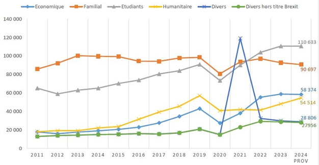 Cette panique résulte d’un fait simple et qui semble affoler les conservateurs et l’extrême-droite. Selon les chiffres du ministère de l’Intérieur, les admissions au séjour sur motif d’études sont passées de 58 930 en 2012 à 110 633 en 2024, soit une augmentation de 88% en douze ans. C’est aujourd’hui l’un des tout premiers canaux d’immigration régulière, avant même l’immigration familiale (90 700 en 2024, relativement stable sur 10 ans).